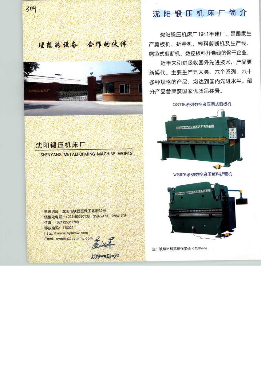 沈陽鍛壓機床廠是機械電子工業(yè)部生產剪切機床的重點企業(yè),是國家生產剪板機、折彎機、棒料剪斷機及棒料溫剪生產線、鱷魚式剪斷機的骨干企業(yè)。產品具有技術先進、造型美觀、功能獨特、制造精良、結構牢固、性能可靠、安全耐用、價格合理等特點,廣泛用于機械、汽車、橋梁、鍋爐、礦山、鋼管、鍛造等行業(yè).尤其是近年來引進了國外先進技術,產品不斷更新?lián)Q代,生產的各種規(guī)格的鍛壓產品均達到國際先進水平。 親愛的用戶朋友,與我們相識,是您的機遇;我們與您相識,絕對是我們的榮幸!能為您提供我們的優(yōu)異產品, 能幫您解決您生產上遇到的困惑,是我們的責任和我們愿意做的.我們愿與您一道,在企業(yè)發(fā)展的路上,互幫互勉,攜手前進.