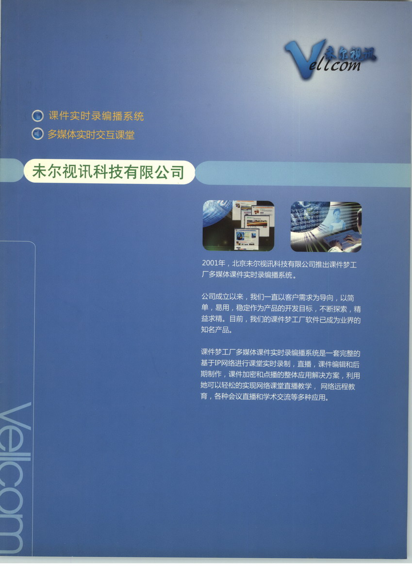 北京未爾視訊科技有限公司(Beijing Vellcom Technology Co. ,Ltd )成立于2002年,位于北京市海淀區(qū)上地中關(guān)村國家留學(xué)創(chuàng)業(yè)園,是由美國硅谷留學(xué)科研人員創(chuàng)辦的具有自主知識(shí)產(chǎn)權(quán)的高新技術(shù)企業(yè),專業(yè)致力于手持移動(dòng)終端的軟硬件設(shè)計(jì),多媒體通信軟件及圖像處理技術(shù)的研究開發(fā)和銷售,公司所有員工均擁有大學(xué)以上學(xué)歷,研發(fā)人員主要來自清華大學(xué),技術(shù)帶頭人為多媒體和移動(dòng)通信領(lǐng)域的留美博士,有多年的海外工作經(jīng)歷和產(chǎn)品研發(fā)經(jīng)驗(yàn),公司強(qiáng)大的技術(shù)研發(fā)團(tuán)隊(duì),為公司研發(fā)一流產(chǎn)品提供了強(qiáng)有力的技術(shù)保障。公司產(chǎn)品包括手持終端移動(dòng)考勤系統(tǒng),課件夢工廠工具軟件系列、實(shí)時(shí)互動(dòng)直播課堂系統(tǒng)、資源管理系統(tǒng)、數(shù)字版權(quán)管理系統(tǒng)等。我們的用戶遍及全國各地并已經(jīng)開始進(jìn)入海外市場,國內(nèi)成功的用戶包括國家發(fā)改委,中國海關(guān),中國銀行,國家質(zhì)監(jiān)總局,中國移動(dòng)通信公司,北京大學(xué)、清華大學(xué)、中國人民大學(xué)、北京航空航天大學(xué)、北京師范大學(xué)、中山大學(xué)、西北工業(yè)大學(xué)等各類用戶群體。