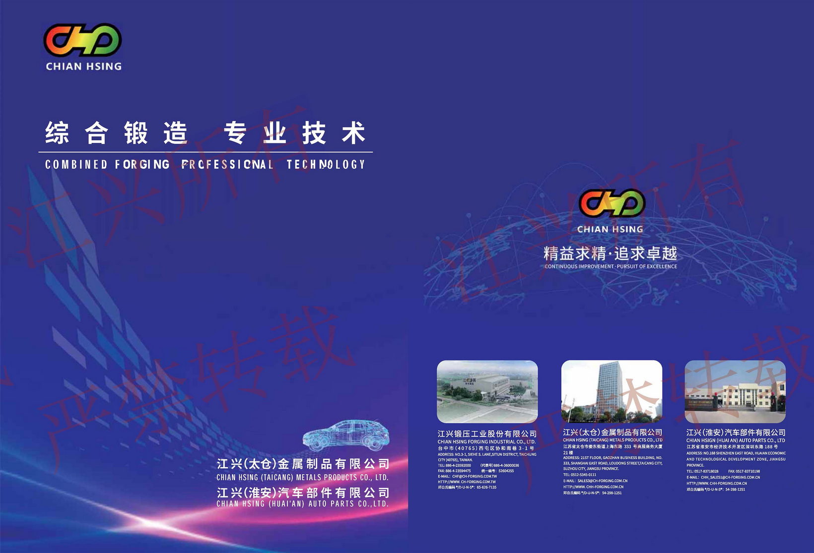 江興鍛壓工業(yè)股份有限公司自西元1971年創(chuàng)立以來,秉持著「顧客滿意、同仁樂意、經(jīng)營得意、永續(xù)經(jīng)營」之經(jīng)營理念,不斷開發(fā)綜合鍛造之技術(shù),使本公司所生產(chǎn)的鍛品更優(yōu)良、更精密、更能減少切削加工,使鍛品更臻于理想。于1997年在江蘇省太倉市設(shè)立江興(太倉)金屬制品有限公司,以及2012年設(shè)立江興(淮安)汽車部件有限公司,延續(xù)臺(tái)灣總部的經(jīng)營理念和專業(yè)技能,持續(xù)在國內(nèi)發(fā)展并精進(jìn)冷溫?zé)峋C合鍛造技術(shù)。