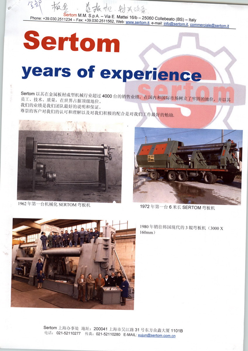 六十年代,SERTOM制造了自己的第一臺(tái)全液壓驅(qū)動(dòng)卷板機(jī),在歐洲首先實(shí)現(xiàn)了輥?zhàn)拥囊簤赫{(diào)平裝置,1972年安裝于美國俄亥俄容器公司的4000×90mm卷板機(jī)是公司早期的代表作品,該設(shè)備至今仍然運(yùn)行良好、每天工作8個(gè)小時(shí)。