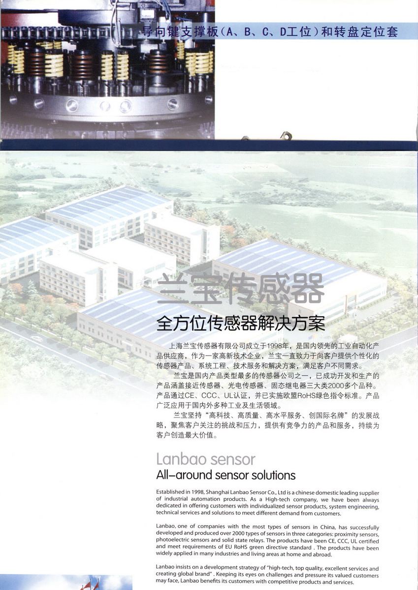 蘭寶傳感科技股份有限公司主要業(yè)務(wù)為工業(yè)測控傳感器的研發(fā)、生產(chǎn)、銷售及應(yīng)用,為客戶提供標(biāo)準(zhǔn)化和定制化的工業(yè)測控傳感器及工業(yè)測控傳感系統(tǒng)。產(chǎn)品系列已通過CCC認證、CE認證、UL認證和ISO9001:2008質(zhì)量管理體系認證,并已實施歐盟RoHS環(huán)保指令,主要包括電感式傳感器、光電式傳感器、電容式傳感器和陶瓷厚膜壓力傳感器等三十多個系列、3000余種規(guī)格型號。各項產(chǎn)品技術(shù)性能居行業(yè)領(lǐng)先地位,其中多個系列產(chǎn)品達到國際先進水平。蘭寶依托自身技術(shù)優(yōu)勢為客戶定制符合需求的工業(yè)測控傳感系統(tǒng)。