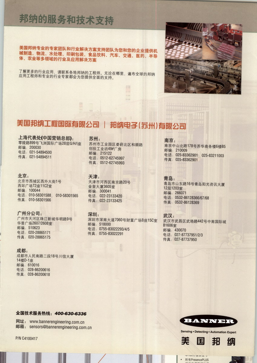 邦納電子(蘇州)有限公司是美國邦納在中國的全資子公司,總部位于美國的明尼蘇達州,是全球頂尖的自動化技術(shù)專家和整體解決方案提供者。公司擁有22,000多種產(chǎn)品,具有最為齊全的產(chǎn)品線,包括:光電傳感器、測量與檢測產(chǎn)品、工業(yè)無線網(wǎng)絡(luò)產(chǎn)品、視覺傳感器、安全產(chǎn)品、工業(yè)智能指示燈及旋轉(zhuǎn)編碼器系列,能滿足各種不同的檢測需求。在40多年的發(fā)展過程中,邦納公司始終將創(chuàng)新作為產(chǎn)品應用與研發(fā)的源動力。