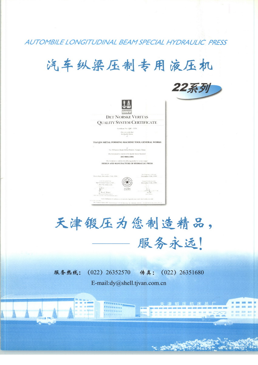 天津市鍛壓機(jī)床總廠是我國起步最早的企業(yè),現(xiàn)有固定資產(chǎn)2.4億元各類專業(yè)技術(shù)人員480人,是機(jī)戒部大型骨干企業(yè)。自我廠自行設(shè)計(jì)國內(nèi)第一臺液壓機(jī),開創(chuàng)了我國中小型液壓機(jī)生產(chǎn)歷史以來,目前擁有26個(gè)系列,300余品種,產(chǎn)品從80KN至5000KN,以形成年產(chǎn)1200臺各類液壓機(jī)的生產(chǎn)能力,居國內(nèi)同行業(yè)之首。1983年YT32-315四柱液壓機(jī)獲國家銀牌,1990年YT32-630/1030雙動(dòng)力拉伸液壓機(jī)一舉榮獲同行業(yè)唯一的國家金獎(jiǎng)另有部優(yōu)產(chǎn)品3項(xiàng),市優(yōu)產(chǎn)品5項(xiàng)。產(chǎn)品廣泛適用于汽車制造、粉末冶金、金屬冷擠、輕工家電、化工機(jī)戒、航空航天、模具磨料、機(jī)戒制造等行業(yè),被國家指定為替代進(jìn)口產(chǎn)品,行銷全國,產(chǎn)品出口到日本、荷蘭、東南亞等20多個(gè)地區(qū)和國家、市場占有率居全國同行業(yè)第一。另有部優(yōu)產(chǎn)品3項(xiàng),市優(yōu)產(chǎn)品5項(xiàng)。產(chǎn)品廣泛適用于汽車制造、粉末冶金、金屬冷擠、輕工家電、化工機(jī)戒、航空航天、模具磨料、機(jī)戒制造等行業(yè),被國家指定為替代進(jìn)口產(chǎn)品,行銷全國,產(chǎn)品出口到日本、荷蘭、東南亞等20多個(gè)地區(qū)和國家、市場占有率居全國同行業(yè)第一。作為機(jī)戒部科技進(jìn)步示范企業(yè),充分發(fā)揮全國唯一的液壓機(jī)研究所設(shè)在我廠的技術(shù)優(yōu)勢,在帶領(lǐng)液壓行業(yè)提高技術(shù)水平的同時(shí),以快速的科技進(jìn)步適應(yīng)市場,采用CAD工作站和CAM計(jì)算機(jī)輔助設(shè)計(jì),率先在國內(nèi)成功的采用了比例控制技術(shù)、位置數(shù)字控制技術(shù)、同步控制技術(shù)、觸摸屏技術(shù)等先進(jìn)技術(shù),使產(chǎn)品技術(shù)水平一直處于國內(nèi)領(lǐng)先地位。