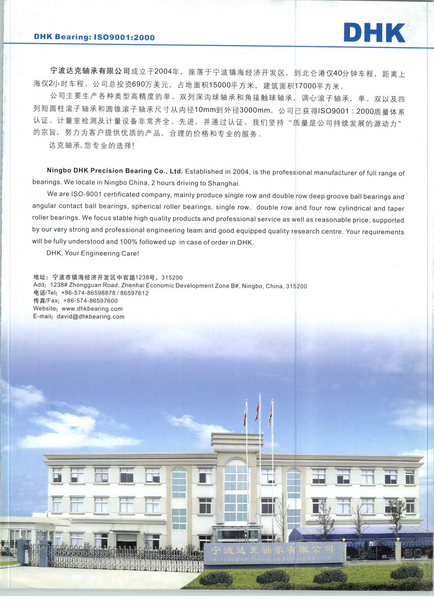 寧波達克軸承有限公司(DHK)是一家專業(yè)從事軸承研發(fā)、生產(chǎn)和銷售的企業(yè),位于交通便利的寧波鎮(zhèn)海經(jīng)濟開發(fā)區(qū)。公司自成立至今,十余年來,一直將“技術”、“品質(zhì)”和“服務”作為企業(yè)發(fā)展之本,為世界級重工企業(yè)長期提供質(zhì)量可靠的產(chǎn)品和專業(yè)定制化的服務,獲得了眾多海內(nèi)外一流企業(yè)的滿意和好評。DHK主要生產(chǎn)圓柱滾子軸承、圓錐滾子軸承、調(diào)心滾子軸承、球軸承以及各類非標準軸承和特殊表面處理軸承。目前,DHK的產(chǎn)品在歐美發(fā)達國家已被廣泛應用于工程機械、工業(yè)泵、機床、風電、冶金等領域。DHK現(xiàn)已擁有行業(yè)領先的軸承計量室和檢測中心,并引進國內(nèi)外尖端的檢測設備,建立了國內(nèi)領先的質(zhì)控體系,全面保證了產(chǎn)品質(zhì)量。作為重工軸承解決方案優(yōu)化專家,DHK具有為客戶提供從產(chǎn)品選型、性能測試、力學分析、應用分析、個性化產(chǎn)品設計與生產(chǎn)、產(chǎn)品優(yōu)化、維修服務等方面的專業(yè)技術服務的能力。