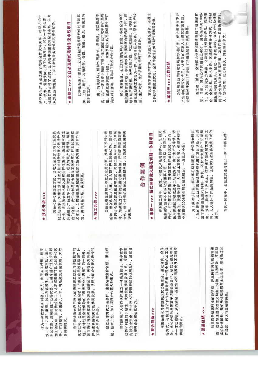 武漢金運激光股份有限公司前身武漢金運激光設(shè)備制造有限公司,是中國激光領(lǐng)域大型雕刻、切割、標(biāo)記設(shè)備生產(chǎn)商,是中國光谷骨干激光設(shè)備生產(chǎn)企業(yè)。自1992年成立以來,在激光、電蝕等特種加工設(shè)備領(lǐng)域不斷開發(fā)出獨具特色和具有自主知識產(chǎn)權(quán)的產(chǎn)品,并在激光應(yīng)用技術(shù)、電蝕刻應(yīng)用技術(shù)、CAD/CAM技術(shù)、CNC技術(shù)以及雕刻、切割工藝上取得了重大突破,真正實現(xiàn)了先進技術(shù)向產(chǎn)業(yè)化的轉(zhuǎn)化工作。金運激光擁有由中國光谷及多名碩士、博士及專業(yè)人才組成的研發(fā)團隊,擁有30000平方米的研發(fā)及生產(chǎn)中心,300名朝氣蓬勃的員工,一流的機械及電子精密加工設(shè)備,年生產(chǎn)能力達3000臺套以上。在國內(nèi)有十多個辦事處和服務(wù)網(wǎng)點,產(chǎn)品遠銷至中東及歐美三十多個國家和地區(qū)。