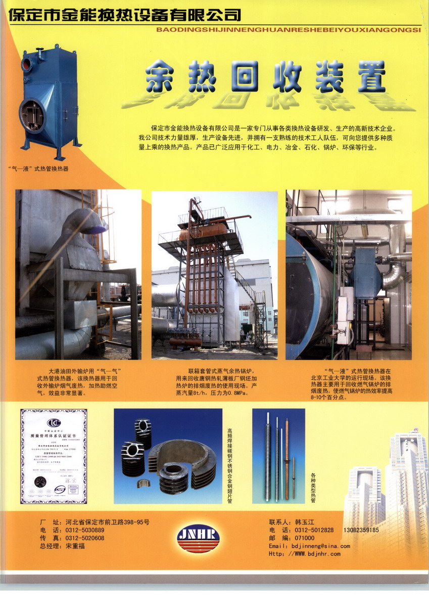 保定市金能換熱設備有限公司是由原保定市機械電器研究所改制組建而成。經過多年奮斗,已發(fā)展成為一家專門從事各類換熱設備設計、生產的高新技術企業(yè)。公司下設空氣冷卻器、余熱回收裝置以及鍋爐壓力容器類產品制造三個事業(yè)部。公司擁有一支經驗豐富的從事換熱節(jié)能和機電設備設計的專家隊伍,其中高級職稱人員8 名,中級職稱人員16名,同時長期聘請北京、天津地區(qū)大學教授及科研單位專家12名作為技術顧問,同時招收了一批近年畢業(yè)的大學畢業(yè)生并長期聘用,形成了一支新老結合,校企結合,具備雄厚技術實力的研發(fā)隊伍。經過多年努力,公司取得了大量的科研成果,獲得了多項省部級科技進步獎和節(jié)能獎,有多篇學術論文發(fā)表在國內期刊和全國熱管會議上,公司具有完善的生產設施和過硬的生產隊伍。同時獲得了十三項換熱設備國家專利,即:一種淬火油冷卻和回收其余熱的熱管換熱設備 專利號:ZL 201310176520.3;淬火介質空氣冷卻器 專利號:ZL 032 49016.X;感應加熱設備全封閉空氣冷卻系統 專利號:ZL 2011 2 0319224.0;復合式熱管換熱設備 專利號:ZL 2007 2 0128522.5;帶有翅片的螺旋溝槽換熱管 專利號:ZL 2008 2 0132976.4;一種淬火油冷卻和回收其余熱的熱管換熱設備 專利號:ZL 201320259690.3;一種深度回收煙氣中冷凝水潛熱的燃氣鍋爐 專利號:201320712598.8;第三代煙氣余熱回收冷凝器專利號:ZL201420073823.2等。目前,公司可以設計生產多種節(jié)能、環(huán)保及高效的換熱設備。主要產品有三大類:空氣冷卻器、余熱回收設備及鍋爐、壓力容器這三大類的產品以及配件,包括冷卻各類介質的空氣冷卻器、冷卻中高頻感應加熱電源設備的空氣冷卻器及其他各種空氣冷卻器;余熱回收裝置、鍋爐、余熱鍋爐、各類余熱回收換熱器、冷凝器、加熱器、交換器、風機、各類低中壓壓力容器、真空干燥機、熱風爐等;高頻焊接不銹鋼(1Cr18Ni9Ti、0Cr18Ni9)、合金鋼(12Cr5Mo)及耐腐蝕的ND鋼和碳素鋼螺旋翅片管,并可按用戶要求生產加工各類換熱設備。公司研發(fā)的余熱回收熱管換熱器產品被國家工信部列入《節(jié)能機電設備(產品)推薦目錄》(第三批);空氣冷卻器產品被財政部、國家稅務總局、國家發(fā)展改革委關于執(zhí)行環(huán)境保護專用設備企業(yè)所得稅優(yōu)惠目錄,節(jié)能節(jié)水專用設備企業(yè)所得稅優(yōu)惠目錄和安全生產專用設備企業(yè)所得稅優(yōu)惠目錄,財稅〔2008〕48號文件;財稅〔2008〕115號文件。2010年空冷器產品被中國機械工業(yè)聯合會授予“機械工業(yè)節(jié)能機電產品” 稱號。2009年被中國熱處理行業(yè)協會列入《熱處理行業(yè)節(jié)能和清潔生產先進技術與裝備目錄》公司的換熱設備已遍布全國二十幾個省、市、自治區(qū),部分產品已出口到泰國、土耳其、越南、日本等國家,用戶分布在石油、熱處理、化工、鋼鐵、冶金、汽車、電力、建材、輕紡、環(huán)保等行業(yè)。
