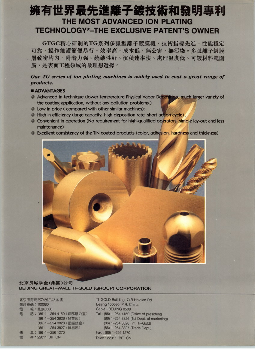 北京長(zhǎng)城鈦金公司致力于鍍膜技術(shù)的研究與應(yīng)用,是中國(guó)首屈一指的物理蒸 氣沉著(PVD)鍍膜技術(shù)的科研成果開發(fā),設(shè)備制造和銷售中心。真空離子鍍膜的第 三代技術(shù),等離子體加速器型離子鍍膜法,是當(dāng)今國(guó)際上最先進(jìn)的表面工程技術(shù) 之一,也是復(fù)合材料領(lǐng)域里的一項(xiàng)高難課題。用此法得到的膜層,除具有細(xì)密均 勻,結(jié)合力強(qiáng),超硬,耐磨,抗腐蝕,良好的導(dǎo)電性能和自潤(rùn)滑性能等優(yōu)點(diǎn),還 能提供豐富華麗的色彩。本公司生產(chǎn)的TG系列設(shè)備,可用來鍍單層或復(fù)合層 的TiN,ZrN,TiO,TiC,TiNC,TiAlN或稀貴金屬Au,Ag,Ta,Nb,Mo,W等裝飾 和功能涂膜。可用于鐘表,首飾,燈具,餐炊器具,五金工藝,玻璃,陶瓷,衛(wèi) 浴和建筑材料等類似產(chǎn)品的表面鍍膜,其特點(diǎn)是色彩豐富、品質(zhì)高貴。另一方面 ,鈦金功能鍍?cè)诠ぞ撸>?,重型機(jī)械,航空,航天,艦船,兵器和電子等領(lǐng)域 也有日益廣泛的應(yīng)用前景:硬質(zhì)的功能膜層不僅可以提高工件的使用壽命,而且 提高切削速度,表面光潔度和抗腐蝕性與耐磨性,大大地提高機(jī)械制造業(yè)的自動(dòng) 化程度。作為同行業(yè)的龍頭,長(zhǎng)城鈦金公司為適應(yīng)國(guó)際化的需要,又率先將 TG系列離子鍍膜設(shè)備提高到了國(guó)際水準(zhǔn):成為中國(guó)同行業(yè)里唯一的企業(yè),既達(dá)到 美國(guó)的UL標(biāo)準(zhǔn),又獲得歐洲的CE證書 公司后續(xù)引進(jìn)開發(fā)爆炸噴涂設(shè)備,歡迎到北京長(zhǎng)城鈦金公司訪問考察!