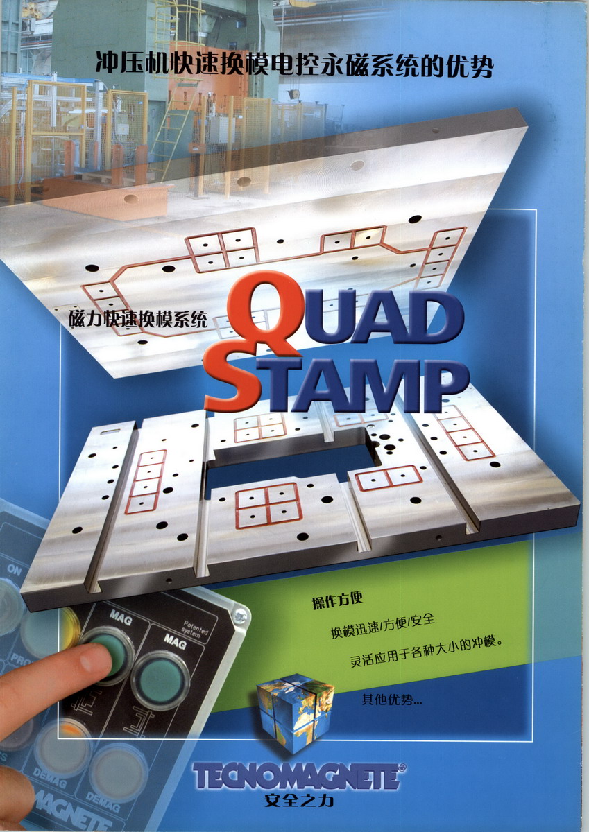泰磁快速換模系統作為一個完整的解決方案用來滿足先進的制造過程中小批量、多類別生產的JIT(實時生產)和SMED(快速更換)的要求。 采用完美的“雙磁極對流”技術,具有磁場集中,磁吸附力強,不磁化設備,克服間隙能力強,磁穿透高度可控等優點。將電控永磁的磁力的應用發回到極致。 意大利泰磁公司Tecnomagnete S.p.A.始建于1972年,是全球電控永磁產品領域中的領先公司,發明了一系列革命性創新產品,設計、制造全系列電控永磁夾持及吊重系統。產品包括:注塑機快速換模系統、銑削、磨削、立車、鐵軌加工用電控永磁夾盤、手動永磁吊重器及重型電控永磁吊重設備(用于成卷鋼帶、大型鋼板等的吊運)等。